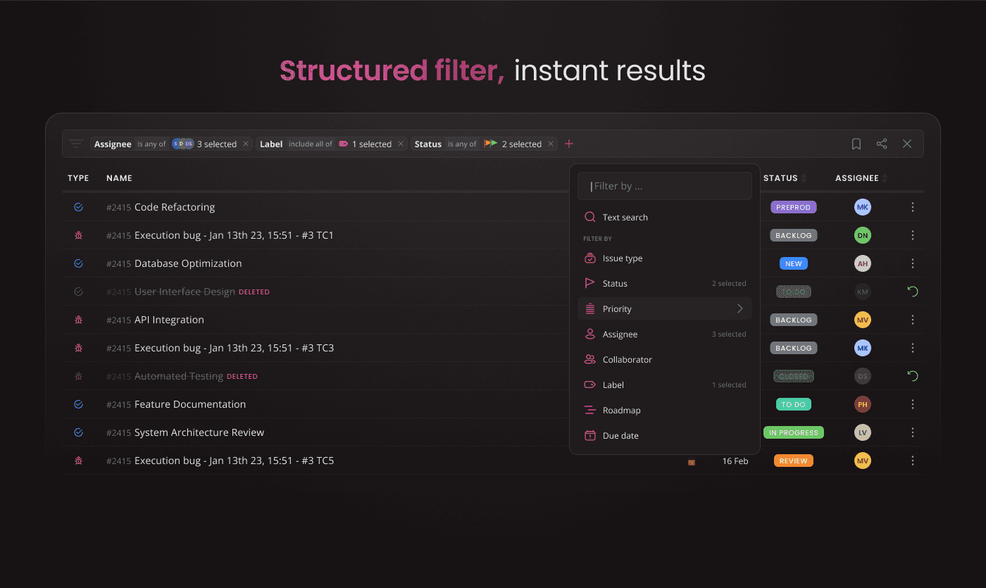 The new layout highlights key information while reducing visual noise. Users can also customize visible elements and group issues by properties such as status, assignee, or priority.