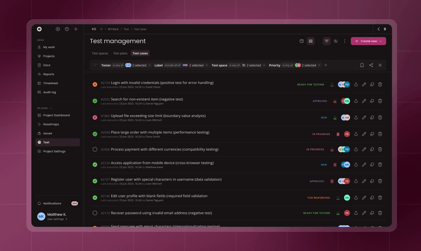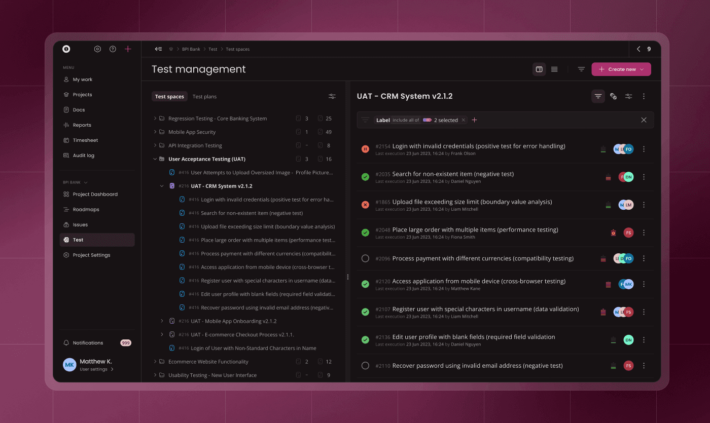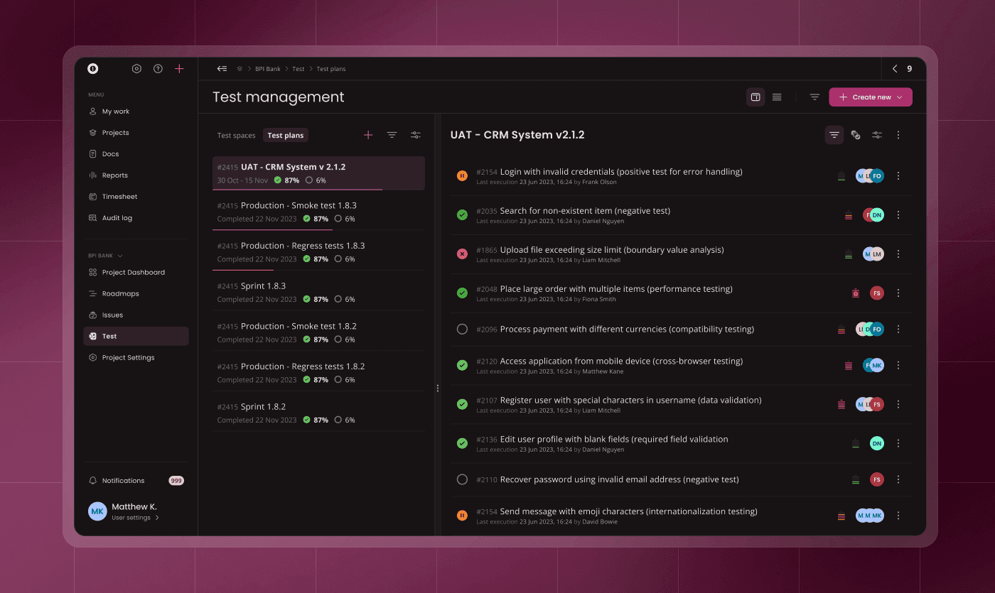 I led the end-to-end redesign of the module, focusing on structuring test management, simplifying execution, and improving traceability between tests and issues.
