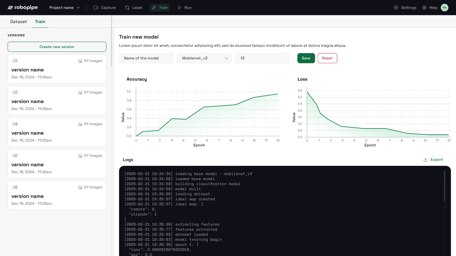 Robopipe allows models to be trained and deployed directly within the platform ecosystem.